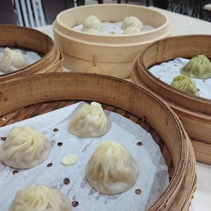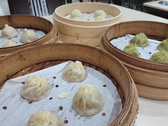 なんと待ち時間ゼロ!(ガイドさんも初めてのことのようで長いと30前後は待つそうです)小籠包(1人4個)、海老・野菜・魚の焼売(1人各1個)、酸辣湯、空芯菜、炒飯、こしあんの小籠包(だったと思います)。次々出てきてどれも美味しい!サービスも行き届いていました。