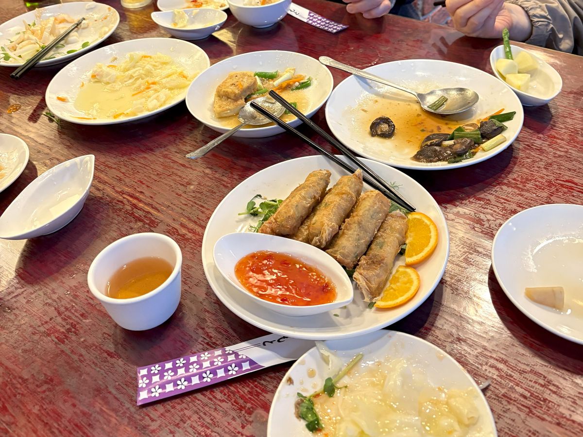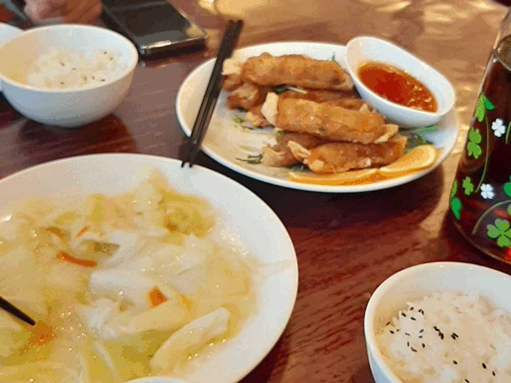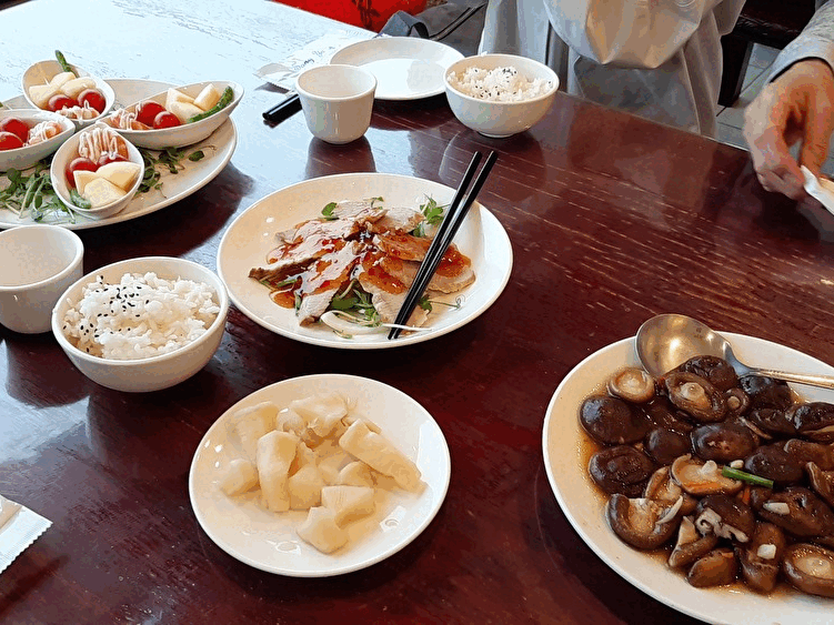 料理は次々とスムーズに運ばれてきました。お茶は温かいか冷たいかを選べ、冷たいお茶は加糖ですが甘さ控えめで食事と相性抜群。エビ、鶏肉、焼売、白身魚の蒸し物、卵や海苔入りの具沢山スープなどボリュームたっぷりでした。特にエビマヨ(?)のような料理はご飯との相性が抜群。どれも優しい味わいでした。観光の合間にほっとひと息つけるお食事スポットです。