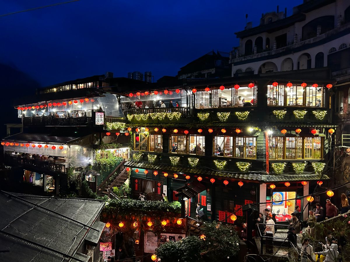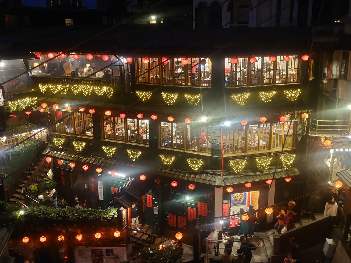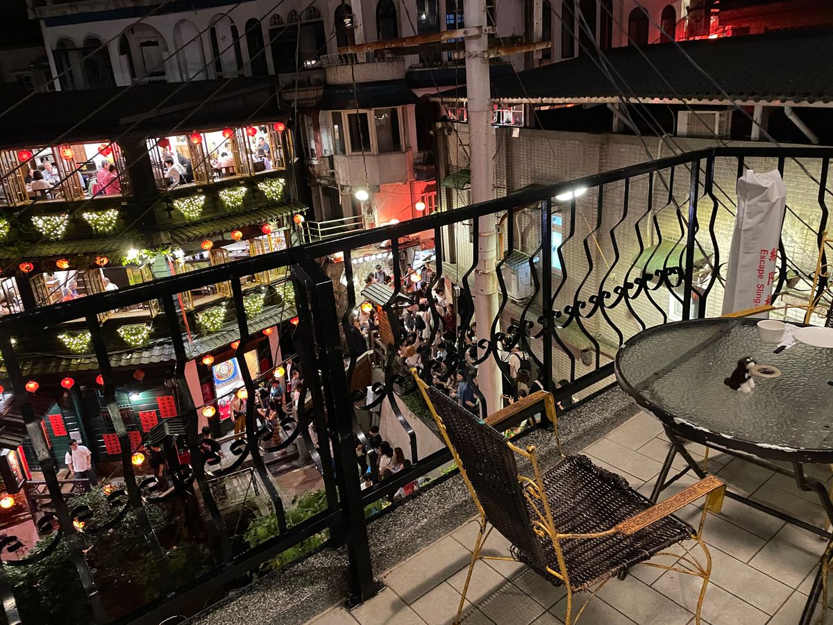 台北初訪問の友人たちと一緒に行きました。私は前に九份にツアーで一度来ていて、前回は阿妹茶楼のお茶付きだったので阿妹茶楼に入ったのですが、あちらに入ってしまうと、あのお店の提灯が並ぶ夜景の写真はほぼ撮れないので、今回はその向いの海悦楼の予約をとりました。