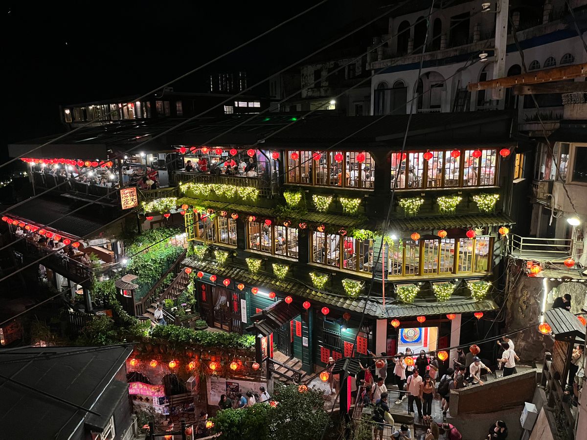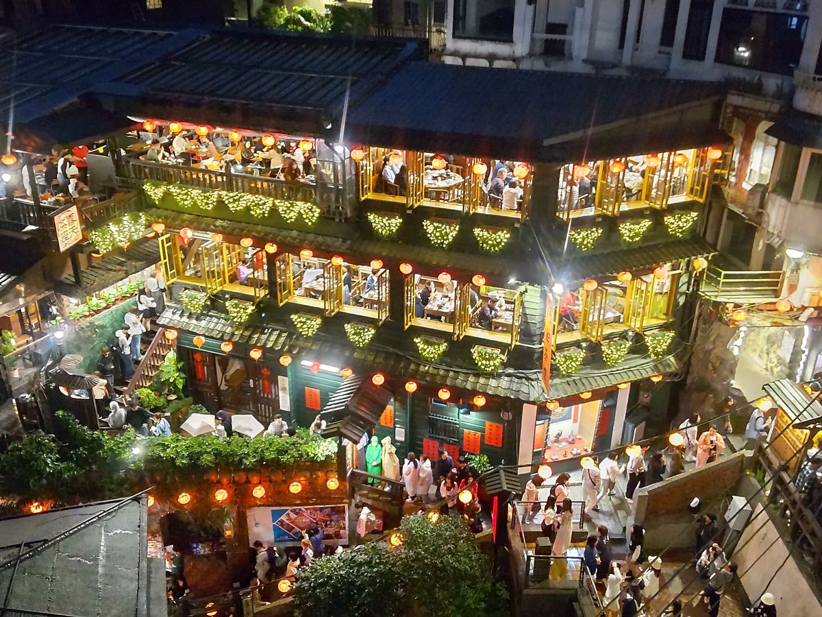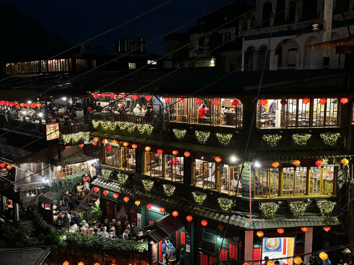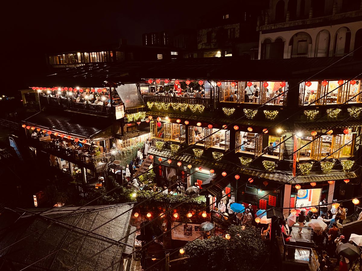 台北初訪問の友人たちと一緒に行きました。私は前に九份にツアーで一度来ていて、前回は阿妹茶楼のお茶付きだったので阿妹茶楼に入ったのですが、あちらに入ってしまうと、あのお店の提灯が並ぶ夜景の写真はほぼ撮れないので、今回はその向いの海悦楼の予約をとりました。
