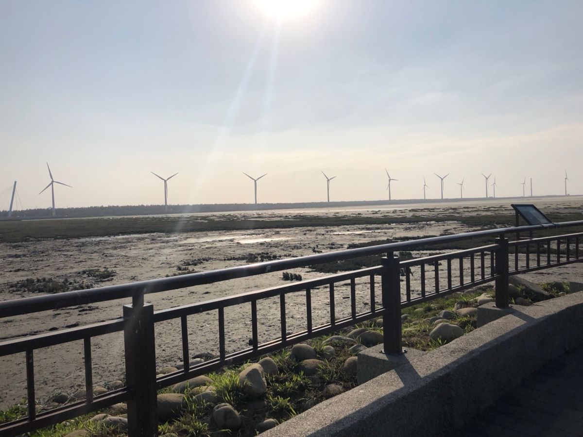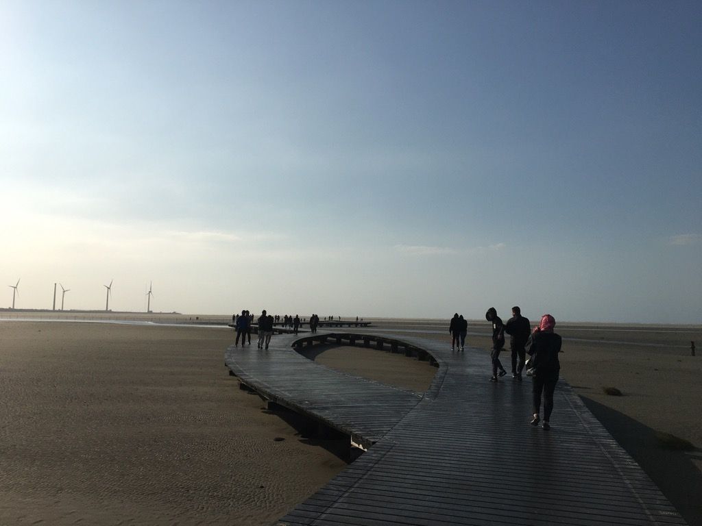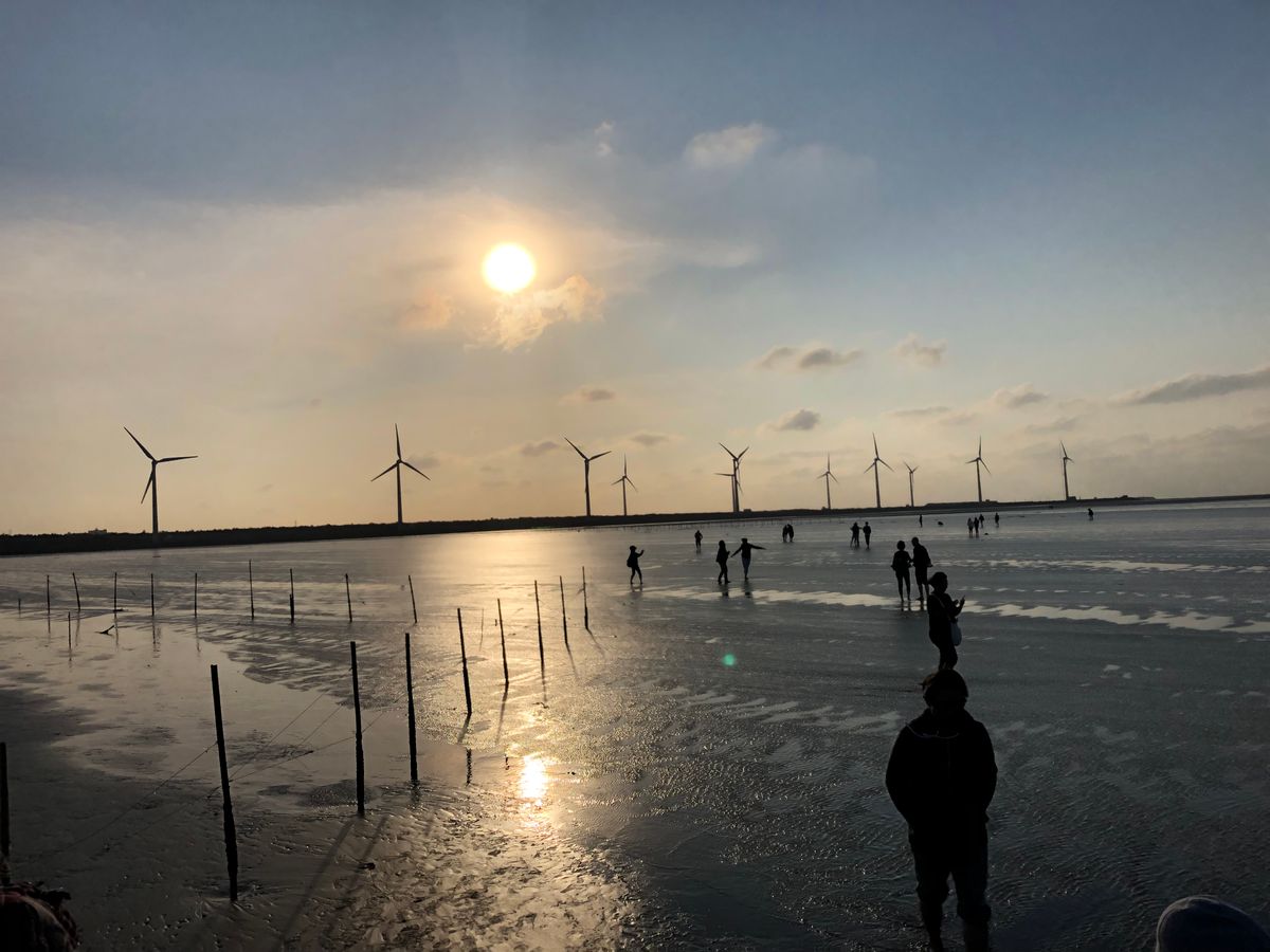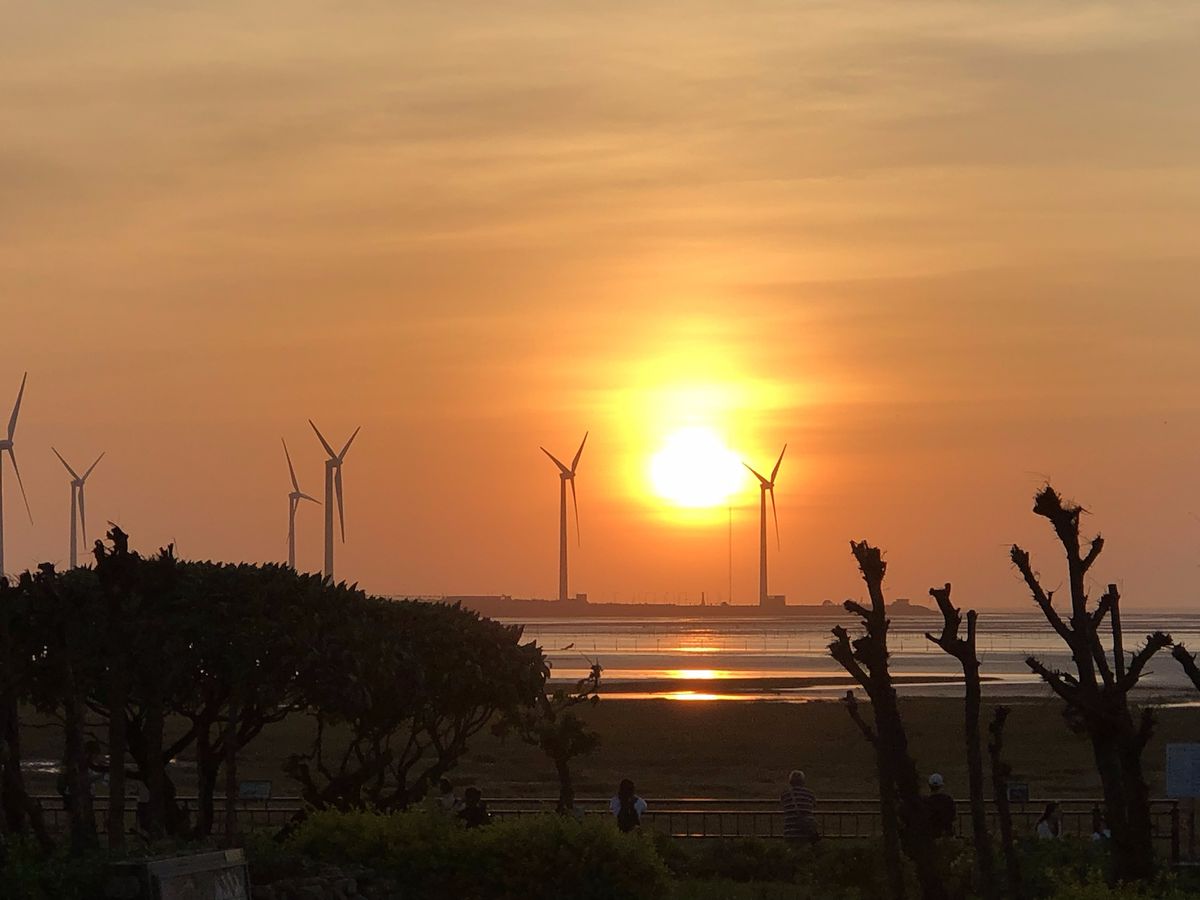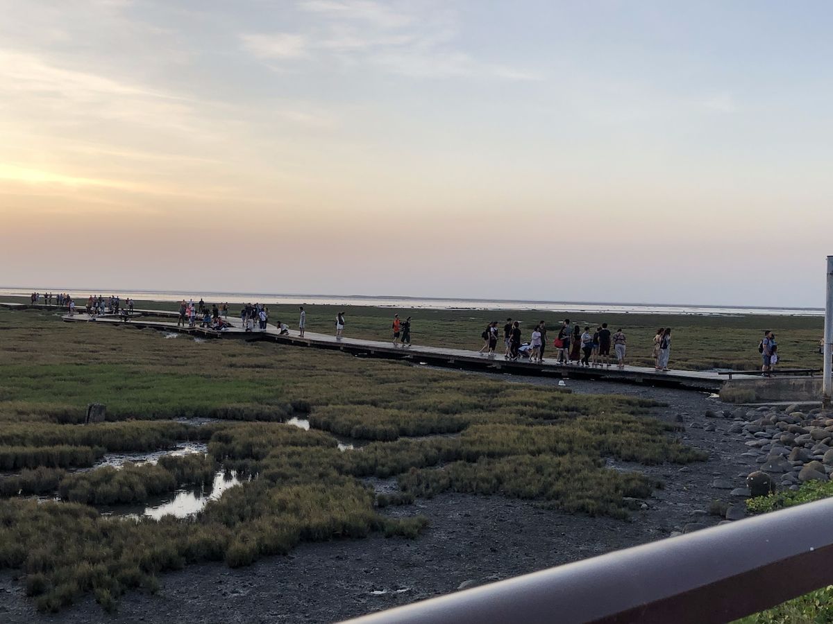 【高美湿地】は海の中に風力発電機が並ぶ、あまり今までに見たこと景色でした。時刻は夕方だったため少し傾いた太陽が海をオレンジ色に染めていて、ノスタルジックな雰囲気を醸し出していました。人は少し多かったですが、それを補っても余りある景色に満足です。