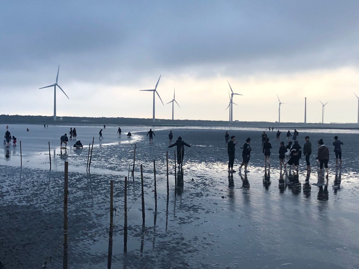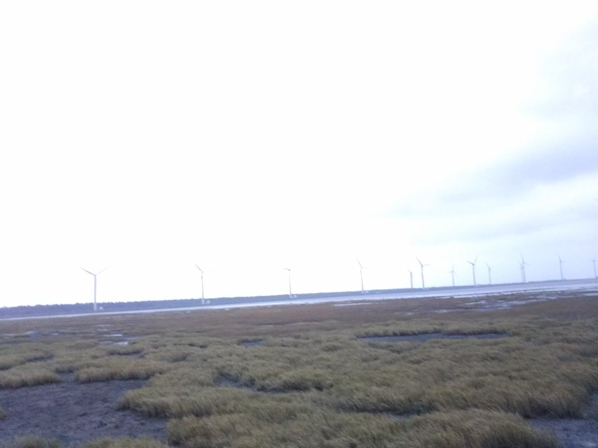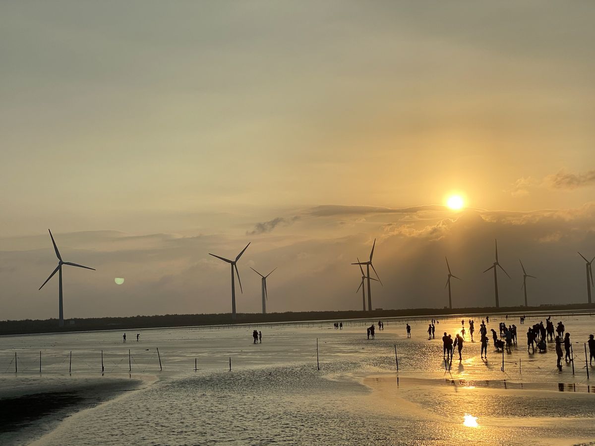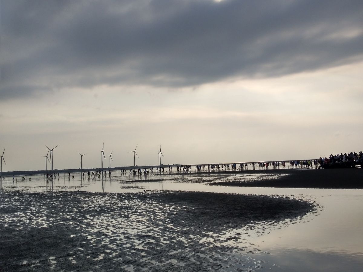 【高美湿地】は海の中に風力発電機が並ぶ、あまり今までに見たこと景色でした。時刻は夕方だったため少し傾いた太陽が海をオレンジ色に染めていて、ノスタルジックな雰囲気を醸し出していました。人は少し多かったですが、それを補っても余りある景色に満足です。