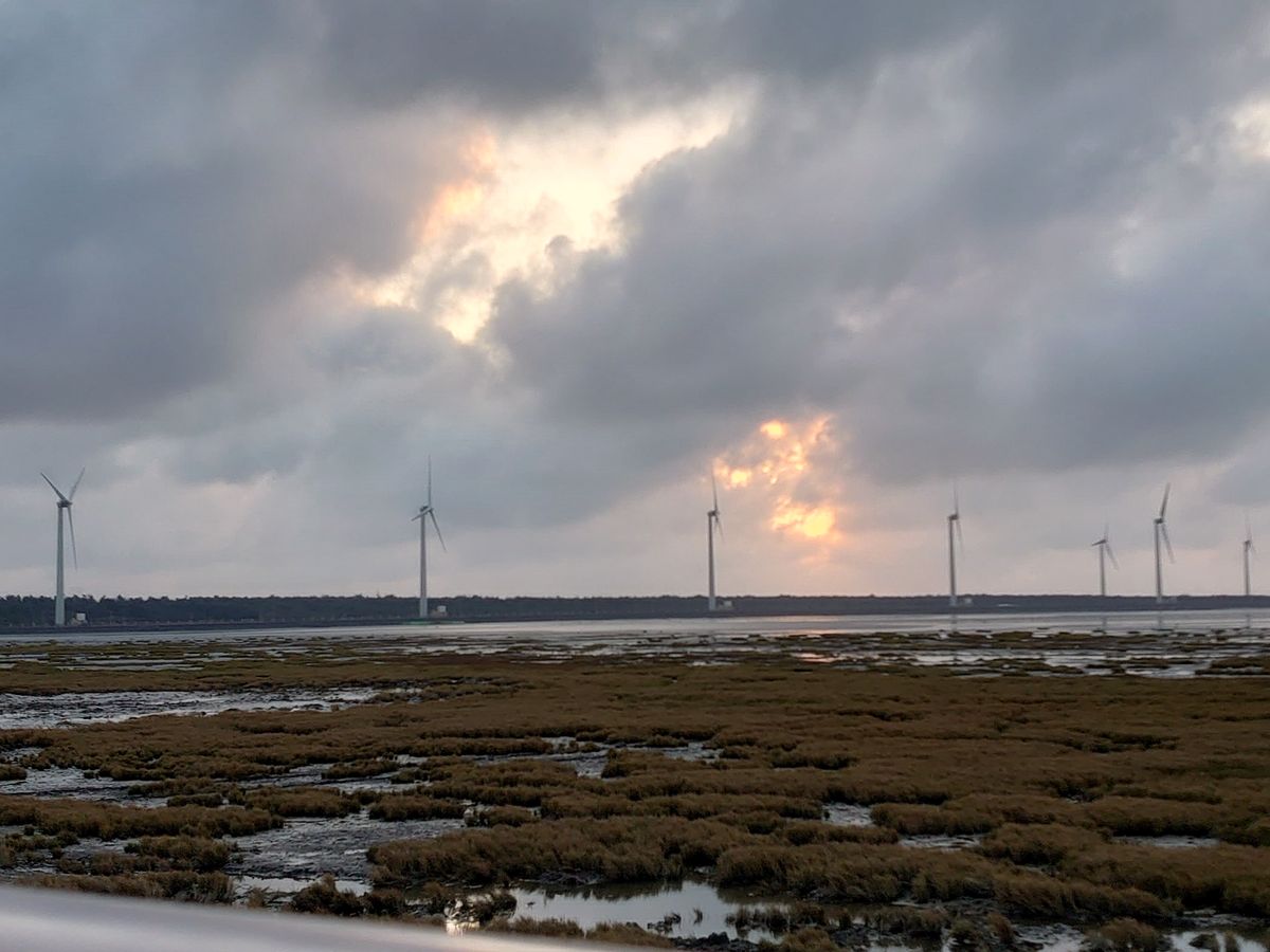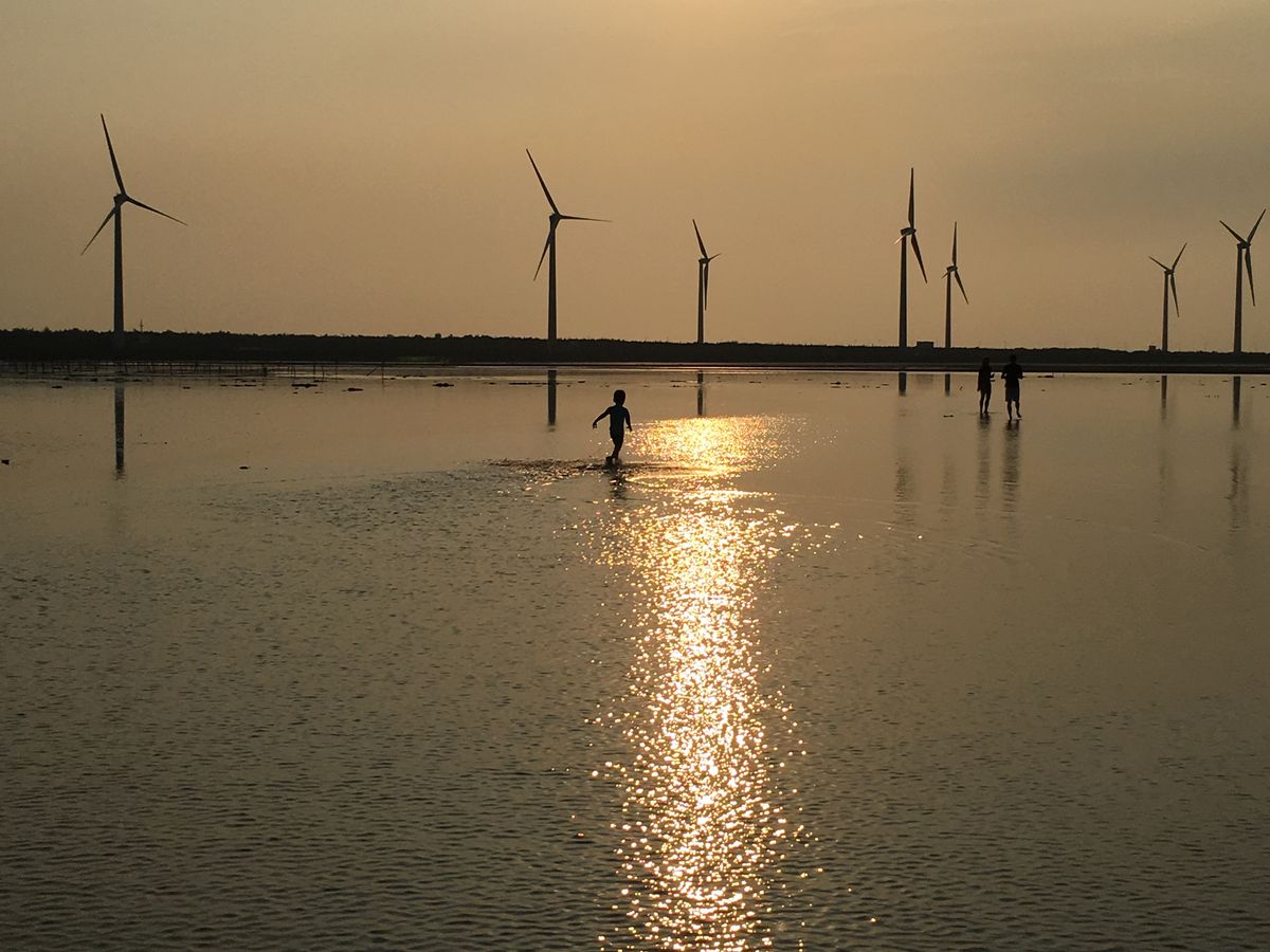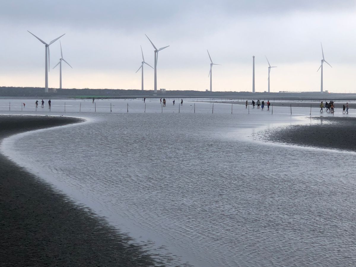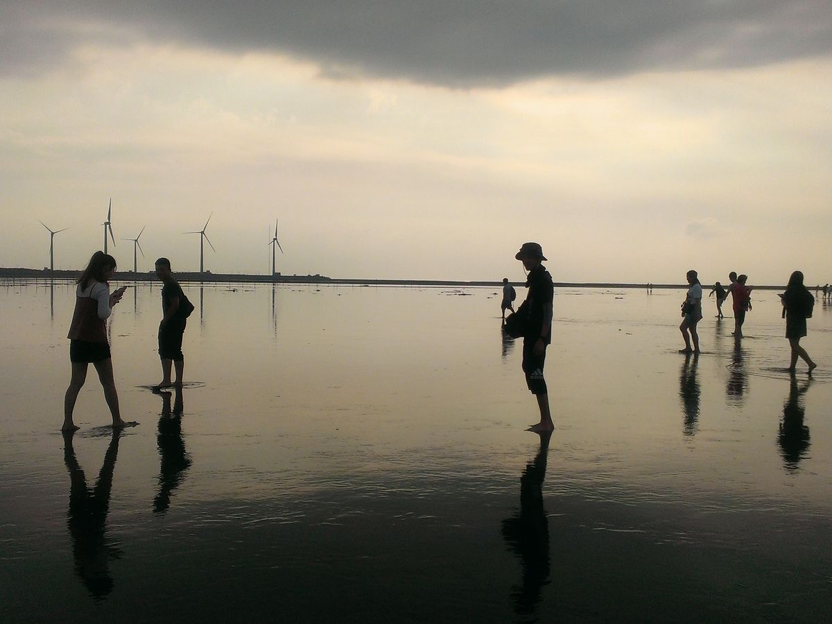 【高美湿地】は海の中に風力発電機が並ぶ、あまり今までに見たこと景色でした。時刻は夕方だったため少し傾いた太陽が海をオレンジ色に染めていて、ノスタルジックな雰囲気を醸し出していました。人は少し多かったですが、それを補っても余りある景色に満足です。