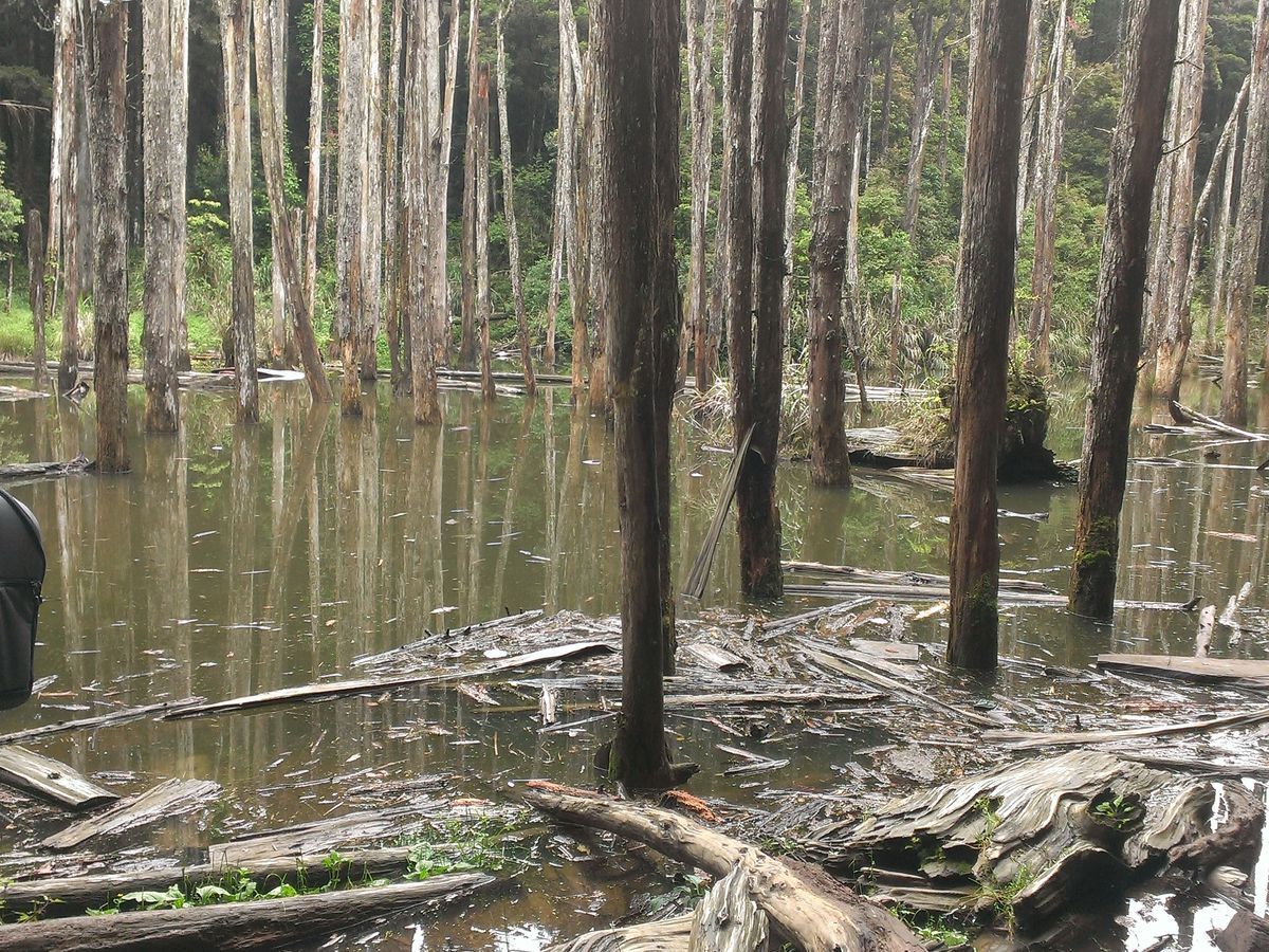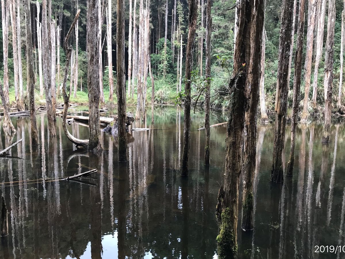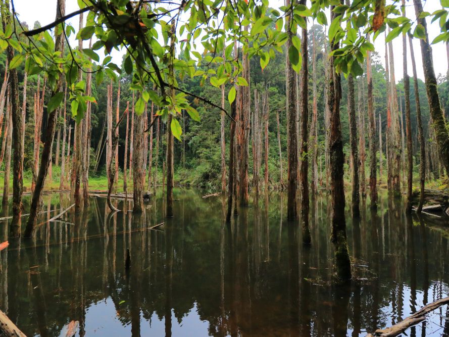 ■5分ほど歩いたら目の前には透明な池の中に死んだ木が立つ、不思議な光景が広がりました。曰く、30年ほど前に起きた地震で出来上がった自然の賜物のようで、雨が降ると池となるそうです。ということは、干上がってる時期もあるのかもしれません。
