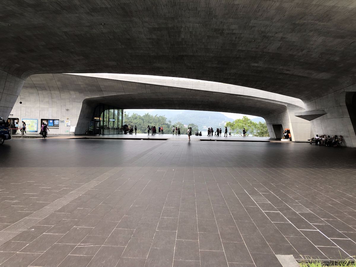 ■車に揺られる事1時間、少しずつ観光バスが増えてきて第二の目的地である【日月潭】の【向山ビジターセンター】へ到着しました。そのプラザは独創的な形をしていて、ガイドのキョウさん曰く日本人デザイナーさんがデザインしたもののようです。誰だろうと調べたところ團 紀彦氏だそうです。
