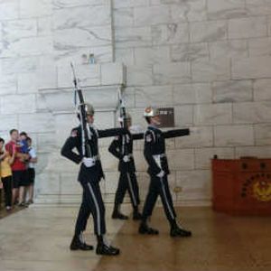 故宮博物館は別に時間をとったので、故宮博物館無しの市内観光ということでこのツアーを選びました。我々二人だけだったのでガイドさんもきめ細かく気をつかってくださりありがたかったです。車窓から市内の見どころを回りお寺でおみくじにトライして台湾気分を味わった後、中正記念堂で衛兵の交代式を見ました(写真)。きりりとしてかっこよいのですが、中国本土との関係の厳しさも感じました。その後お決まりのショッピングなのですが、そこで中国茶の説明をしてくれたおばさんの話がとても面白く思いもかけず楽しめました。そのあと鼎泰豊でランチをとってから展望台で解散でした。ランチの鼎泰豊は大混雑でしたがツアーで予約してあったので待たずに食事ができました。おいしくてお腹いっぱいで大満足でした。展望台はちょっと天気が曇っていたせいで見晴らしはそれほどよくなかったけれど、街全体がよくわかりました。ここは101階建ての高層ビルでマスダンパの制振装置が見られるようになっていて、オタク的に楽しめました。