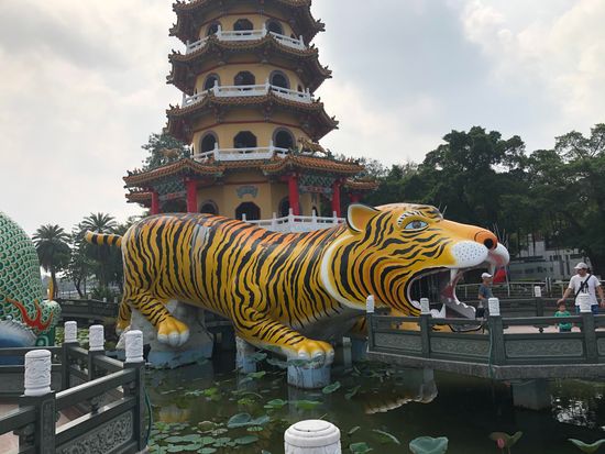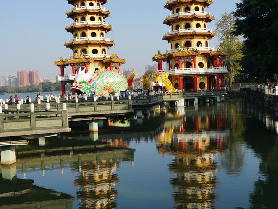池のほとりには廟が点在し、池の中には橋が伸びています。中でも有名なのが、ジグザグな桟橋の先で待ち構える龍と虎。有名な龍虎塔が皆様をお待ちしています。