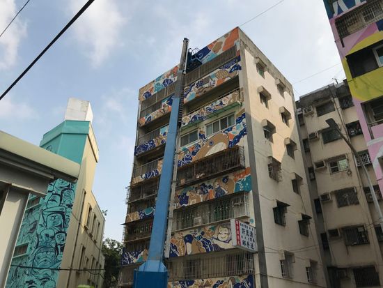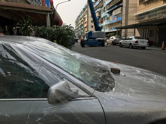 ちょうど私たちが訪れた時には、高所作業車を使ってアパートの7階部分の壁に絵を描いている所でした。住民の方々も協力されていて、絵を描く日には車を移動したり、駐車中の車にはビニールで覆い保護していました。