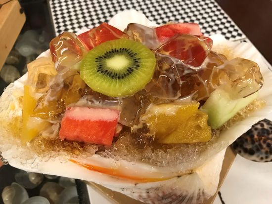 アートな町を楽しんだ後は、かき氷タイム。オーナーが貝殻が大好きという「貝殻氷」というお店です。メニューの中から、一人2つのトッピングを選んでオーダーできます。かき氷は貝殻の上に彩りよく盛られています。これも正にアート。インスタ映えします。