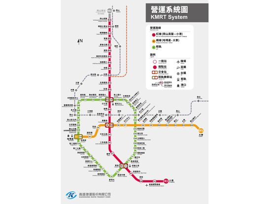 高雄の地下鉄はわかりやすく、紅線(レッドライン)が南北を、橘線(オレンジライン)が東西を結び、その周辺をぐるっと一周ライトレールが走ります。