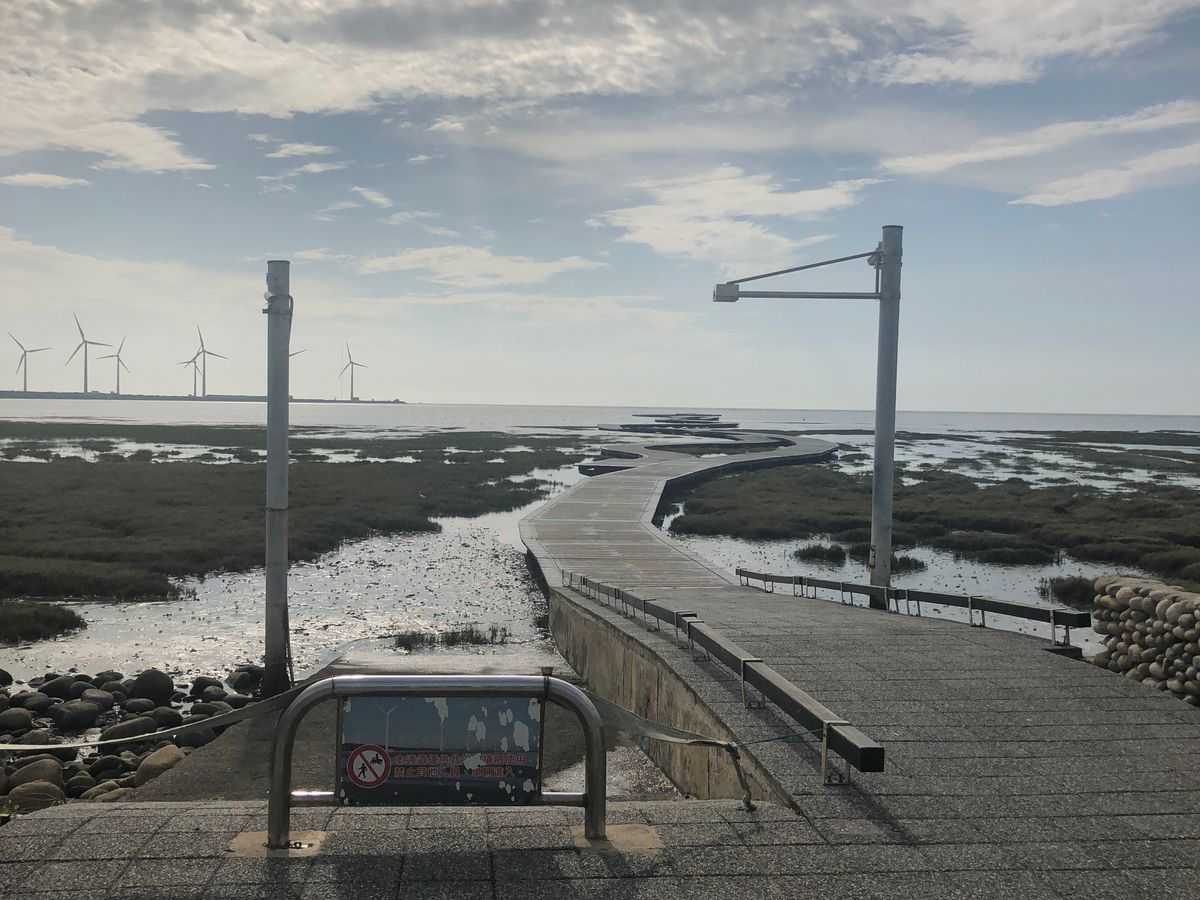 高美湿地は干満の時間が重要ですね。ちょうど満潮だったので、残念ながら桟橋には出られませんでした。
