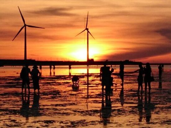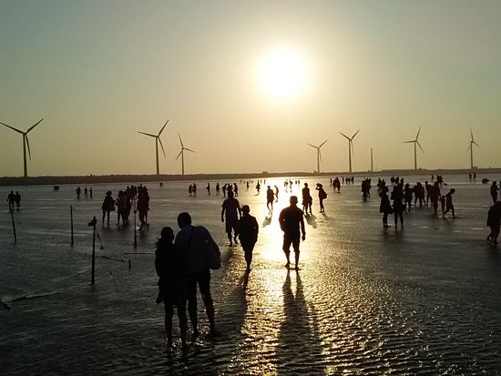 ガイドさんがいて、車に乗って、楽ちんです。見学のための自由時間もたっぷりです。冬の高美湿地は80%が曇りだそうで、夕日が見られないことが多いとのことです。この日も風が強く曇りでした。それでも中国人観光客がたくさん来てごったがえしていました。