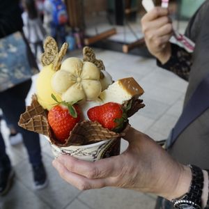 宮原眼科のジェラートは美味しかった。玄関先に蟻が描かれており全部で10匹でありがとうだそうです。