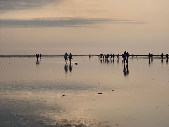 とてもきれいな夕日を見ることができました。水面はくるぶしあたりまでですが、膝丈まで捲れる服のほうが安心です。柔らかな砂地のため裸足で大丈夫でした。夕日を背にすると、人が逆光になるため風景メインの写真が撮れ、夕日に向かうと、人が水面に映りウユニ塩湖という表現に納得する写真が撮れました。水面に上下色まではっきりわかる状態で映る写真はとてもきれいでした!