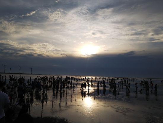 ランチの終わった段階でアシスタントの方と雨なので予定を変更して鹿港老街での観光に時間を取って高美湿地での夕日は無理でしょうという説明だったのですが、鹿港老街に着いたあたりから急に雨があがって、鹿港老街を出る際に運転手の方に高美湿地に行けますか?とLINEで聞いたら行けますよ。との返答。高美湿地に着いた時間が6時前で日没が6時半ぐらい。水位が上がり始めてて水に入れたのは5分程度でしたが干潟にかかる桟橋に腰掛けて皆が夕日が沈むゆったりとした時間を楽しんでいる素敵な場所でした。風も地平線も最高のロケーションでした。