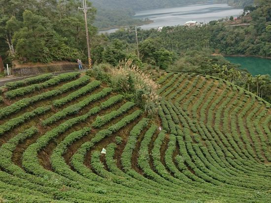 エメラルドグリーンと緑のコントラストが絶景の、台湾でも知る人ぞ知る秘境です。湖岸には八卦(はっけ)茶園を望むことができます。