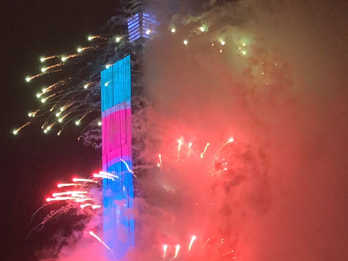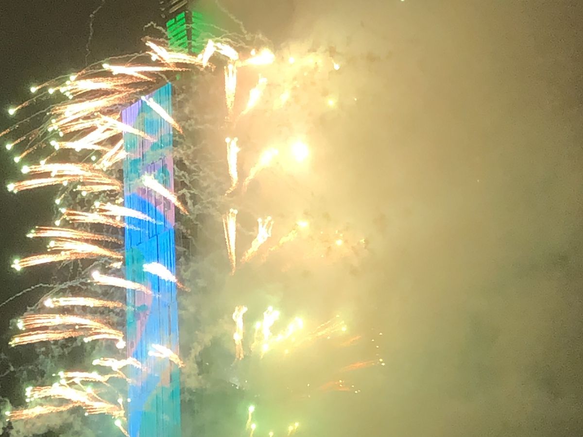 花火の煙と雨雲でプロジェクションマッピングも花火自体も見えにくかったのことが、残念。