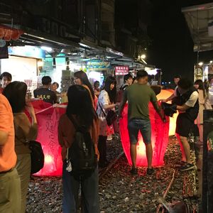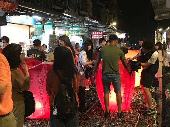 集合場所に行くと、他のコースの人を含め100人くらいの人が待っていました。1組ずつ名前を呼ばれ自分達が呼ばれるまで25分程待ち出発しました。その後すぐに食事に行き18:00過ぎにレストランを出て十分へ。食事は可もなく不可もなく。バスの中ではガイドさんのお話を聞きました。笑顔でいろいろ説明してくれて楽しかったです。十分に着き、天燈に願い事を書き飛ばしました。お店の人が写真を撮ってくれますが、手際よく上手に撮ってくれました。現地滞在は30分くらいですが、お土産を買う時間もあり、バタバタという気はしませんでした。十分は何回か行きましたが、夜の天燈飛ばしは幻想的で素敵でした。そのあとは夜市で解散。この夜市はほとんど食べ物のみなので、レストランの食事を軽くして、ここで食べるのも良いかも。