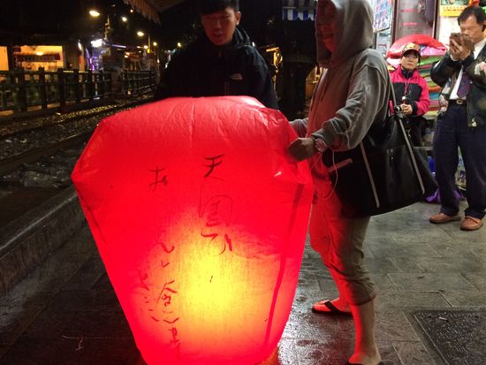 スタッフは写真を撮ってくれるので、カメラを渡し、天燈をあげます。