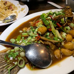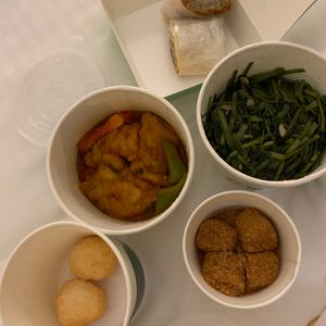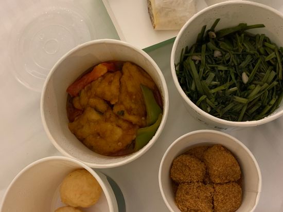 17時30分から予約しました。まるで満員電車を屋外で体験しているような、激混みの九份の中であっという間に席に案内されて座ってご飯が食べられるのはいいのですが、店の奥の席で提灯の景色なんて見れやせず。窓側は他社のツアーにおさえられていて、誰も来ない窓側席を見ながらのディナーでした。食事の内容は普段の家ご飯な感じの素朴なもの。ごはんはパサパサ。でも胃が疲れていた私たちにはちょうど良かったです。