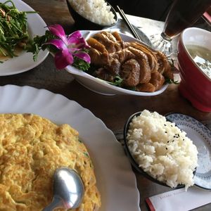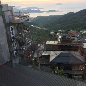 口コミを見てこちらのお店を予約しました。お店は分かりやすく、18:00入店すると待たずに4F窓際の席を案内されました。遠くの海を観ながら日が沈んでいくノスタルジックな九份を楽しむ事が出来ました。お料理は量が沢山で残してしまいましたが(ごめんなさい)、卵焼きや野菜炒めなど素朴で美味しかったです。(予約サービスで小籠包あり)4Fの若い店員さんが感じ良く、また店内はエアコン効いていて涼しいし、席もゆったり本当に居心地が良かったです。席から写真を撮っていると、屋上を勧められ上がると更に素晴らしい眺めで感動してしまいました!(階段が急ですが)こちらを予約して良かったです(^^)