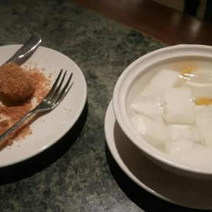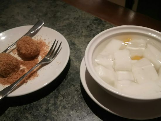 最初の料理が出された後、しばらく間があってその後どんどん出てきましたが、デザートの杏仁豆腐と餅は食べ終わる頃合いを見て出してくれました。