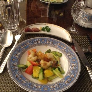 建物が素敵でした。食事は前菜が出た後にフカヒレ、アワビなどいきなり高級素材が続々と。。あとは白身魚のポワレ(?)と豚の角煮、ちまき、フルーツ、マンゴープリンという流れでした。
