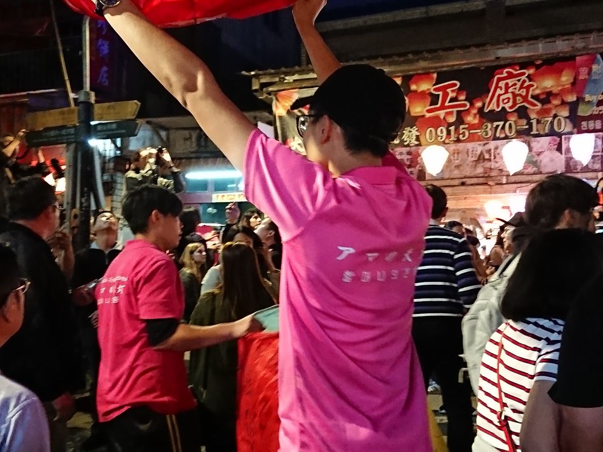 雨が降る中高速で十分へ移動、現地に到着した頃には夕暮れで小雨になり、天燈上げも幻想的な体験になりました。