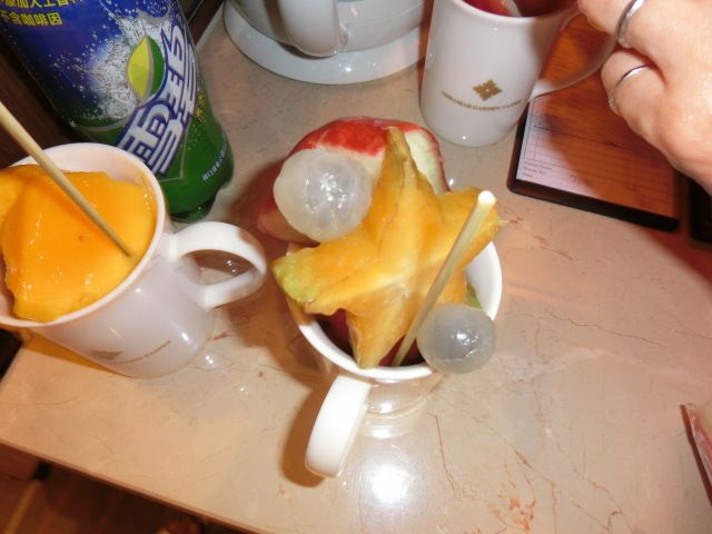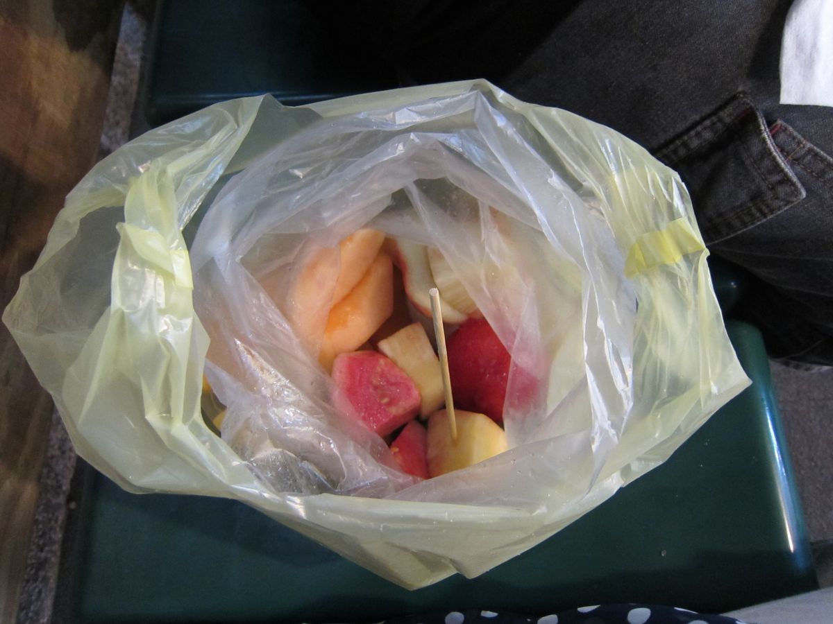 夜市は3つ目なので、ホテルまで送ってもらいました。おなかがいっぱいだったので、買い食いは残念ながらフルーツのみ。桃とマンゴーと赤い皮の梨の様な食感の果物の3種。少し高いなと思いましたが、おまけを一杯入れてくれましたので、ま、良いかなぁと。おまけは桃とマンゴーとスターフルーツと梨(?)となんとライチ!時期が終わっているからあきらめていたので、嬉しかった!!
