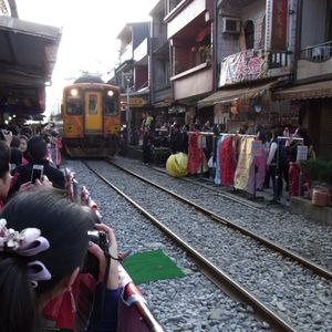中山駅から十分まで約50分位 阿媽の天燈の店に到着4色で200圓です。墨で願い事を書いてる途中真横を列車がすれすれ通って行きます。十分から九分まで1時間結構くねくね道。30分程で展望台下りは階段。お年寄りは大変かも?帰り道は反対方向へ 小さなトンネルを越えると展望台 結構景色が良好。次は黄金滝 十三層遺跡 市内台北101 アイスモンスター お茶屋さんに連れて行かれ、これは要らないね