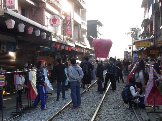始めは九份だけを考えていましたが、こちらの口コミで評判が良かったので十份天燈上げも加えましたが、これが大正解!お天気にも恵まれて、この旅の一番の思い出になりました。願い事を考えるのも楽しく、また、ランタンを空高く上げるのはワクワクする経験でした。九份はきれいな場所でしたが、三連休中日とあって日本人観光客で大大渋滞。(わたしたちもその一員ですが^^;;)人の頭をみながら1周するだけで終わってしまいました。どなたかも書いていらっしゃいましたが、京都の清水寺周辺のお土産物屋などが立ち並ぶ界隈に似ていると感じました。
