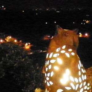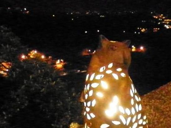 上に行く急な階段は、正直きつかった。私は喘息があるので途中ちょっと、息をととのえました。でも上がりきると、すぐ軽食(結構美味しくて満足)なので、その後は自由な歩調で見ることができました。幸いにも雨に降られることもなく、漆黒の夜空に並ぶ赤い提灯の階段と海風にふかれて茶寮の庭園?で鉄瓶からあがる湯気の音は、癒しそのものでした。娘と私、しばらく無言で時を楽しみました。