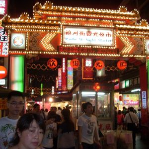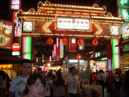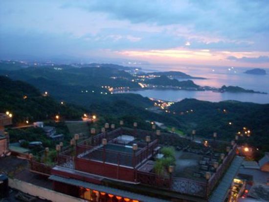 7月4日夕方に滞在ホテル(CASER PARK HOTEL)でピックアップされ、一路九分へ・・台北の近代的町並みから何か懐かしさを感じる景色へとタイムスリップしてゆく景色に満足を覚えながらウトウト・・約一時間後に九分バス停の先で下車し、あのあまりにも有名な急な石段を登ると両脇の店舗に吊るされたランタンに灯がともり始め、後ろを見れば、赤い夕陽が今まさに海のかなたに沈もうとしている・・ガイドブックの写真で体感できない素晴らしいひと時を味わえ満足、満足。はやめの夕食は九戸茶館での海鮮あんかけごはん、本当にうまい!その後約一時間の散策で、悲情城市の撮影に使われたレストランをはじめすてきな町並みを記念撮影し、基山街の九分茶坊で九分原産の東方美人茶を試飲し、その美味なこと!・・ふた缶も買ってしまった。その後土産店を冷やかしながら楽しみ、また、初めて食した臭豆腐を台湾ビールで流し込み、至福のひとときを過ごし大満足で九分をあとにしました。このツアーはこれで終わりではなく、有名な台鉄の松山駅の近くにある夜市(ぎょうかがい観光夜市)にも寄ってくれた。ここは、片道約400mの道を往復して見ることができ、たべものの屋台だけではなく安価で比較的デザインの良い靴や衣服やアイデア小物商品などの店がぎっしりとひしめきあい、こどものころに楽しんだ縁日の露店散策を思い出させてくれた。