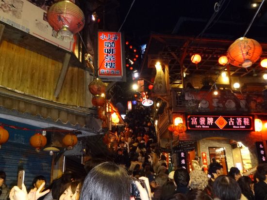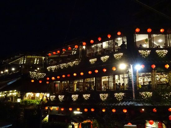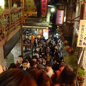 土産物屋のツアーデスクにに集合するが、同種のツアー客でごったがえす。この日は同じツアーがバス9台出ると言って名前が呼ばれるのをじっと待つ状態。バスで一時間足らずで九份に到着。ドライブインのような施設で10人前後に分けられて円卓で夕食をいただくが、ひどい内容。食事もそこそこに九份観光。時間は充分。帰りに夜市に寄ってくれるが、基本は各自のホテル送りなのだが、夜市観光は30分しかとってなく、それ以上いたい人は電車でホテルまで帰ることをやたらガイドが勧める。送ってもいいけどホテルをたくさん回るから2時間近くかかるとガイドは脅す始末。結局ガイドの意に叶いそれまでの大型バスはそこで終わりで、ホテル送りを希望した少ない人は別建てのミニバスが時間に迎えに来るシステム。ほとんどのお客はその場で解散したが、ほてるまでそんなにじかんかかるはずないと疑った我々は、バス送りを選択。案の定乗車10分でホテル到着。本当に、知らないと思って人を馬鹿にした見え透いた小細工をするツアーであった。
