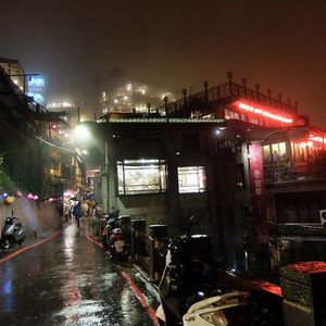 夜になり小雨が降り始める中を出発。バスの中はほぼ満席状態、渋滞も無く九份の駐車場も車が少なく九份の近くまで行けた。参加者は各々九份の町へ散策へ出発、小雨の九份はこれはこれで最高でした。小雨ににじむ提灯の灯、坂の左右に灯りが灯った街並み、本当に千と千尋の町その物でした。お世話して頂いた女性(台湾人)の方も好感持てました。有難う御座いました。