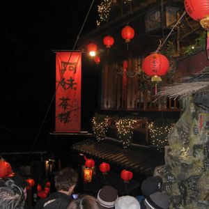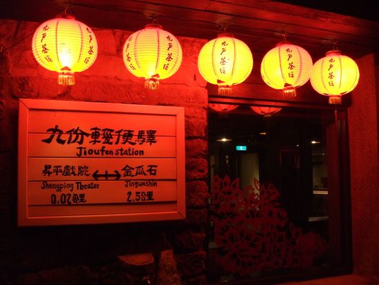 あいにくの雨でしたが,九ふんの明かりが雨ににじんで,いい感じでした。ガイドの方が進めて下さったとおり,お茶をいただいて,お土産に花文字の額を買いました。どちらも満足できるものでした。