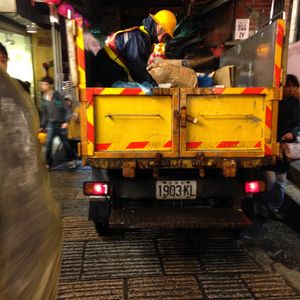 なんのホローも無く怒りはおさまりませんでしたが、母を心配させたくなく我慢。取り残されなければ、完璧な台北旅行でした。以前主人と行ったチェコ旅行の時も、ここのツアーを利用しましたが、こんなことは無く楽しめました。異国の地ではアンテナを張っていないと駄目ですね。写真は清掃車です。狭い道をぐいぐい入ってゴミを回収していました。