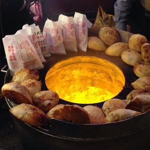 その後夜市へ、胡椒餅は入ってすぐの店でした。すぐに行列に並びゲットしました。