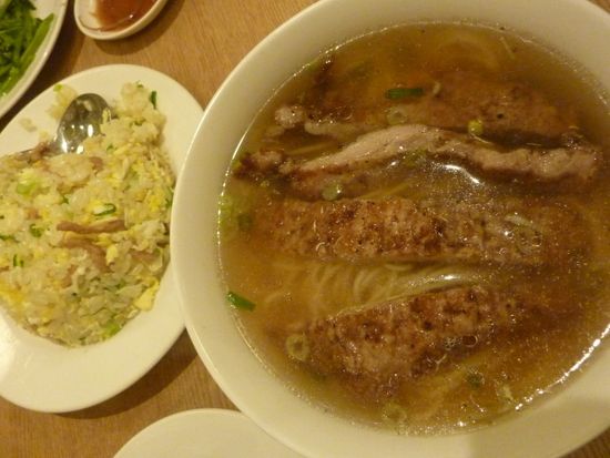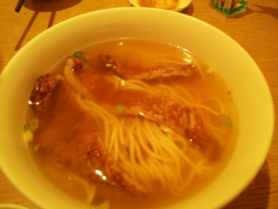 料理はコース料理ですが、次々運ばれてきて、なんかゆっくり食べれない雰囲気。食事前にマンゴかき氷を食べたせいもあって、途中でお腹いっぱい。炒飯の後に大きな豚肉入りの麺が!・・・少しずつ食べてたら、店員さんがさっさと下げてしまった。まだ食べてる途中なのに・・・