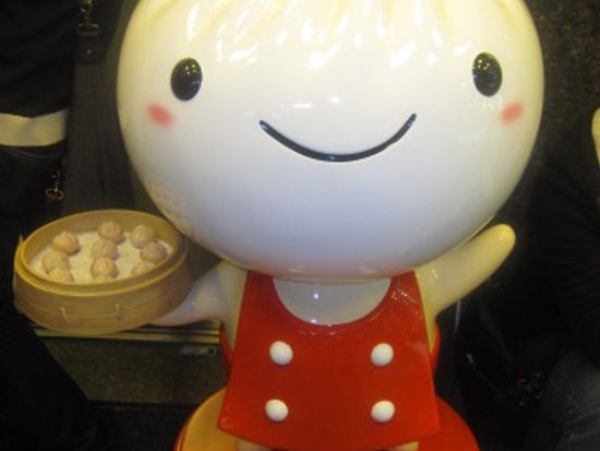 店の前のショウロンポーのゆるキャラと記念撮影していたら