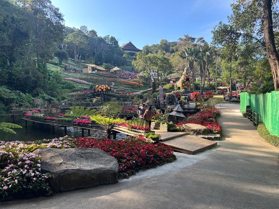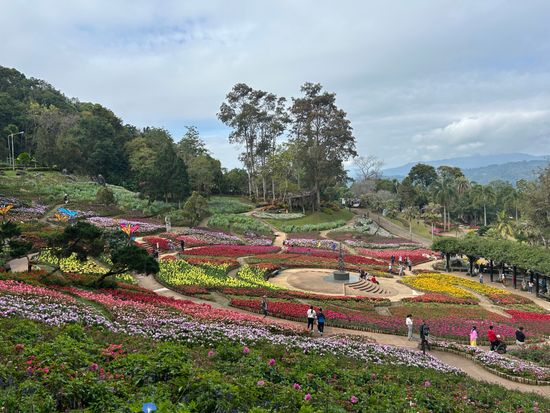 メーファールアンガーデンの景色がサイコー、ラマ9世のお母様のための別荘としてドイトゥン宮殿の花畑景色も最高でした。 国境の感覚がない日本人がゴールデントライアングルに来て、川の反対岸は違う国なんだという状況はなんとも不思議な気持ちを味わえました。お昼ご飯はゴールデントライアングルの食堂屋台で、ガイドさんのお任せ料理が5品も出て来ました。どれも非常に美味しいタイ料理でした。