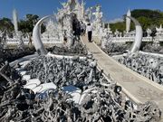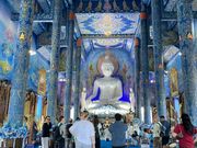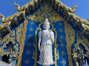 はじめに向かったのはワットロンクン別名White Templeへ、チェンライ出身のタイ人のチャラームチャイ・コシピパット氏個人によって建てられた真っ白なお寺は遠目からみる美しさとは裏腹に実際に訪れてみると寺院にはいちめんに微妙に色が異なるキラキラした銀色のガラスタイルがはめこまれ、光の角度によってさまざまな光を放ち、鬼太郎や悪魔くんのようなおどろおどろしい世界観が広がっていました。続いてブルーテン