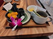 友人との初のバンコクで最終日のお昼からアーユルヴェーダのコースを予約 前の予定が少しおしてチェックイン時間(予約時間の15分前)の5分前ぐらいにナナ駅到着しました 駅の4番出口を出てすぐの大きめの通り(ソイ8)を右に入り直進した右手にあります 遠くはないですが店前まで5分では厳しいです 外でスタッフが待っててくれました すごく綺麗でセンスのいいエントランスロビーでソファに座るとウェルカムフルーツと