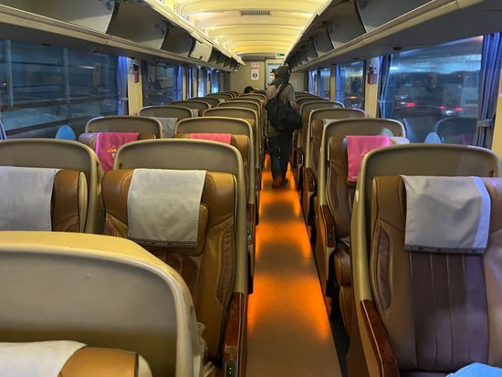 バスに乗車すると、通路を挟んで2-1で大型の皮張りシートが並んでいます。有名航空会社のフルフラットのビジネスクラスほどではありませんが、かなりリクライニングが深いシートです。シェルタイプなので、リクライニングしても後ろの人には何も影響しないのはかなり良いです。シートにはマッサージ機能も付いています。座席の前には飛行機のように個人モニターがあります。日本語対応のものもあるようですが、今回の個人モニターは英語とタイ語のものでした。自分のBluetoothのイヤホンを使えるのは凄く便利ですし、携帯のミラーリングも可能です。映画の種類はあまり多くはないですが、アメリカ映画1本とアニメのカンフーパンダを観ました。