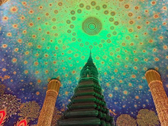 天井に描かれた壮大な壁画には思わず息をするのを忘れてしまうほど。館内の1~3階には仏具などの展示がされており、4階まであがるとエメラルド色をした仏塔があります。その世界観は正に「異彩」ドーム上にはまるで宇宙のような幻想的な世界観が表現されています。実は千葉県成田市に支院があり、日本との縁のある寺院です。