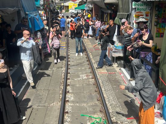 • 急遽列車が故障した場合や列車の大幅な遅延等が生じた場合、市場が折り畳まれる光景をご覧いただけない場合もございますが返金・割引などの対応は致しかねます。代案として、市場と駅が一体化しているもう一つの線路市場「マハチャイ市場」にご案内いたします。但し、電車の見学や乗車はできません。