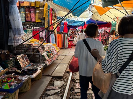 市場の中を列車が走ることで有名なメークロン市場へ。列車運行中の線路上で開かれている驚愕の市場です。列車の通過にあわせ、店舗は広げた商品を一瞬で片付け、通過後にすぐにまた再開。その暮らしぶりが見どころです。