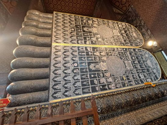 バンコク最古の寺院ワット・ポーは、タイ古式マッサージの総本山。全長46m、高さ15mの黄金の涅槃像はその大きさはもちろん、足裏の螺鈿細工も注目ポイントです。