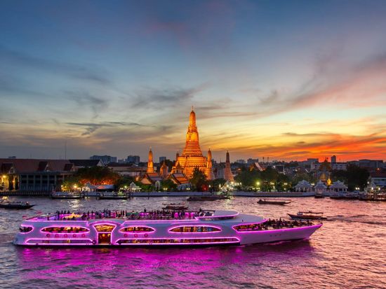チャオプラヤー川から見るバンコクの夜景は必見です!ライトアップされたワット・アルン、王宮、ラマ8世橋など、幻想的な夜景を眺めながら特別な時間をお楽しみください。