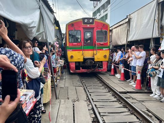 ・列車運行中の線路上で開かれている驚愕の市場、メークロン線路市場